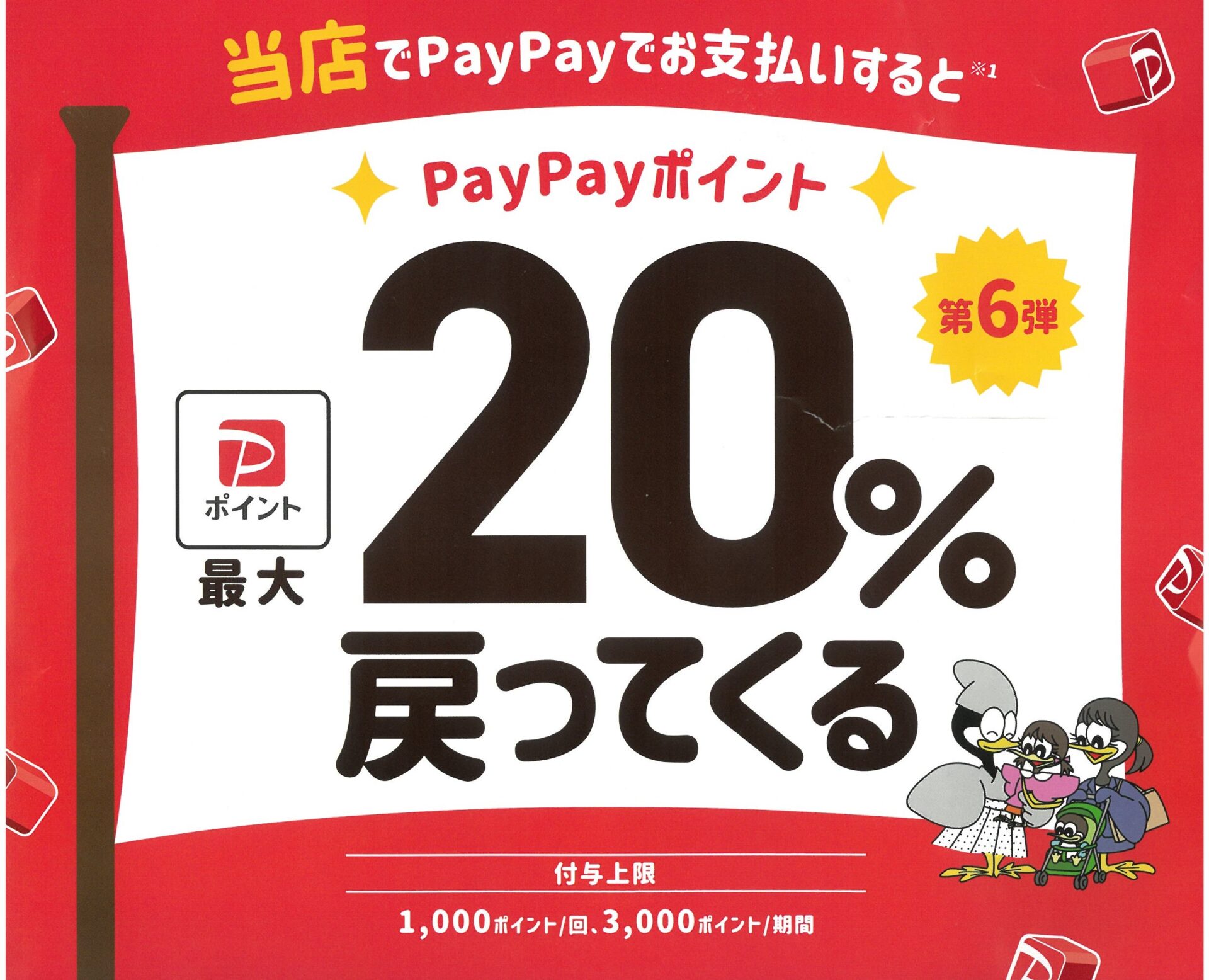 期間中にPayPayでお支払いいただくと、最大20%分のPayPayポイントが還元されます。(付与上限1000ポイント/回)