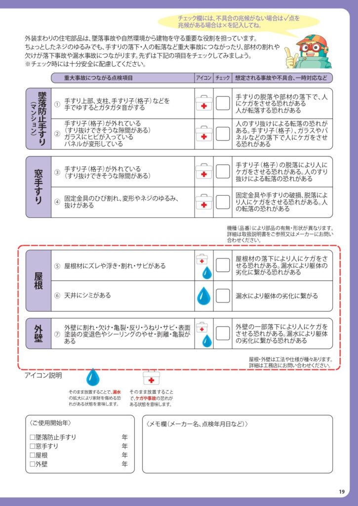 水まわりや建具、設備機器など、住まいのさまざまな住宅部品のセルフチェック項目が