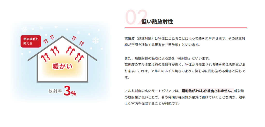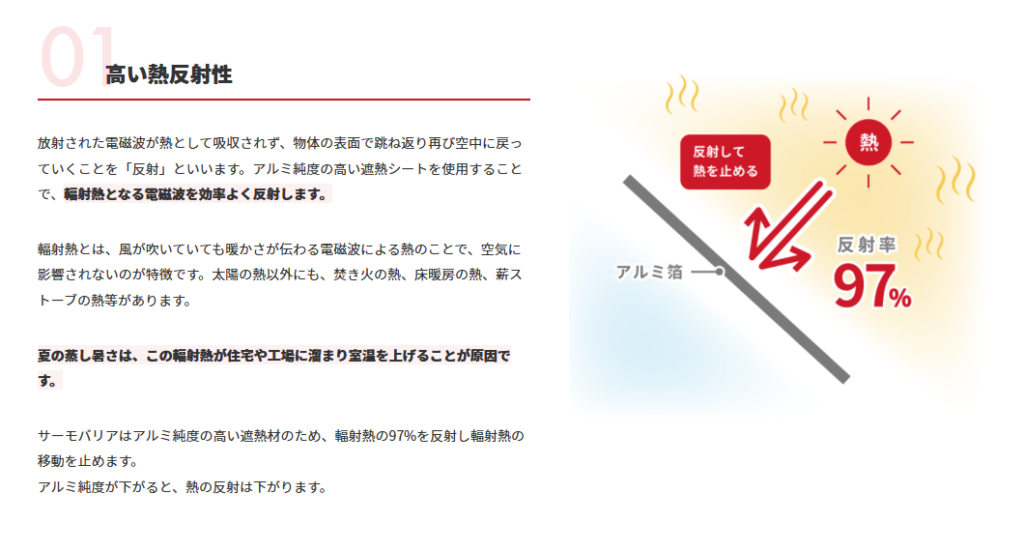 サーモバリアSは、太陽の強い熱(輻射熱)をしっかり反射する「遮熱シート」です。