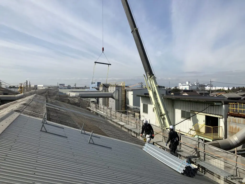 スレート屋根カバー工事🏭T工場(岐阜県岐阜市)①セーフティシート荷上げ作業