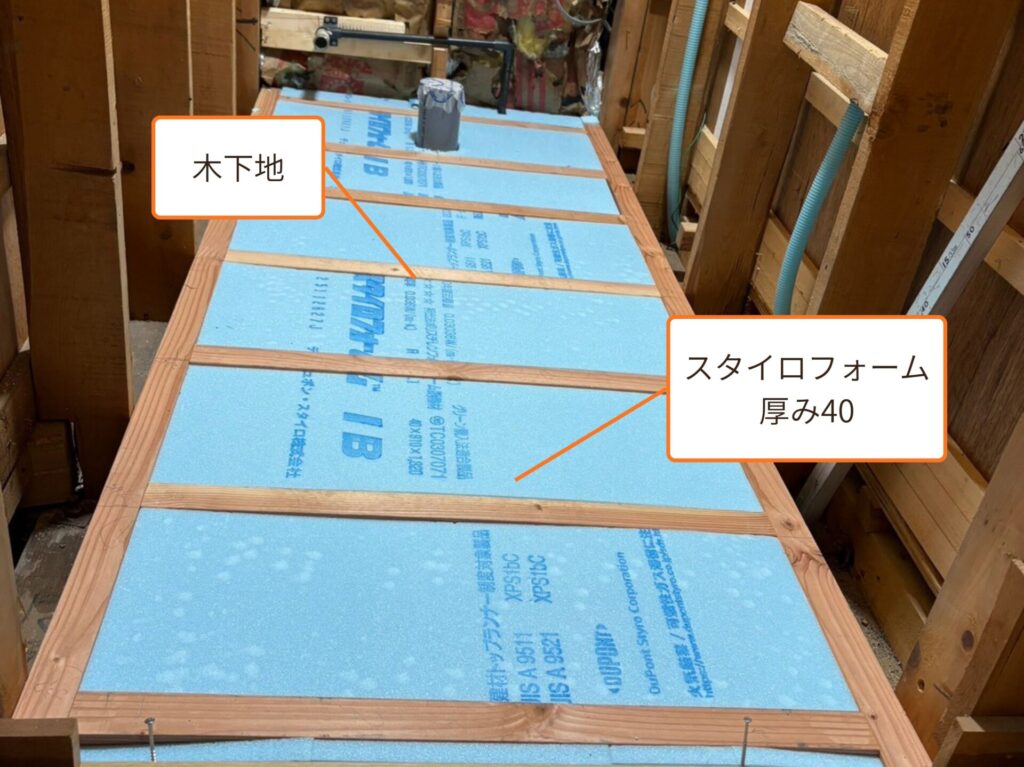 配管移設工事完了後、床・壁に木下地を施工していきました。