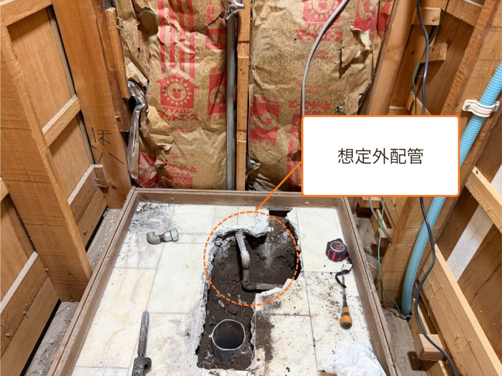 床下の掘削(はつり)時に、図面にはない位置に既存の給水管が見つかるトラブルがありました。