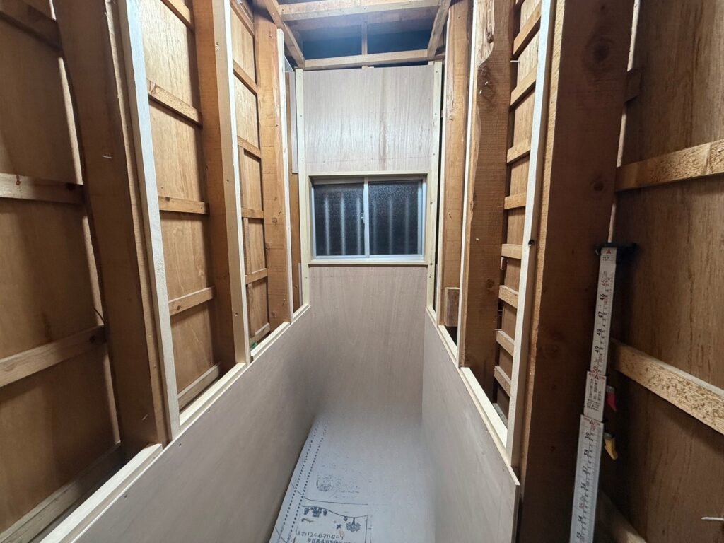 内部にはグラスウール断熱材を隙間なく充填し、ベニヤ下地を施工していきました。