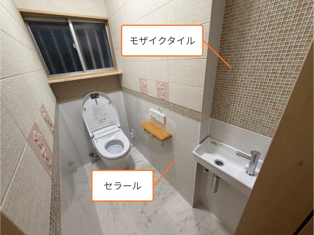 腰上には調湿・脱臭機能を持つ「エコカラット」「モザイクタイル」を、