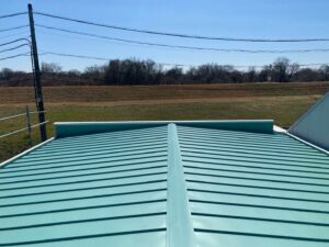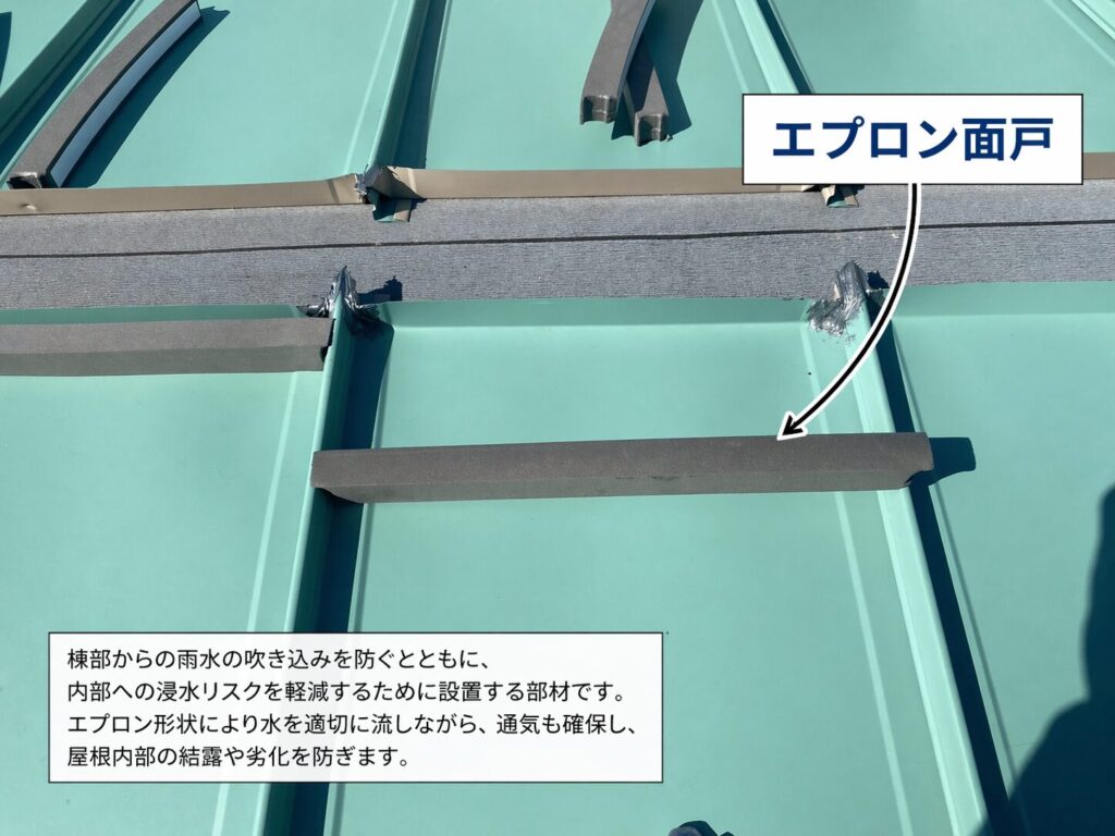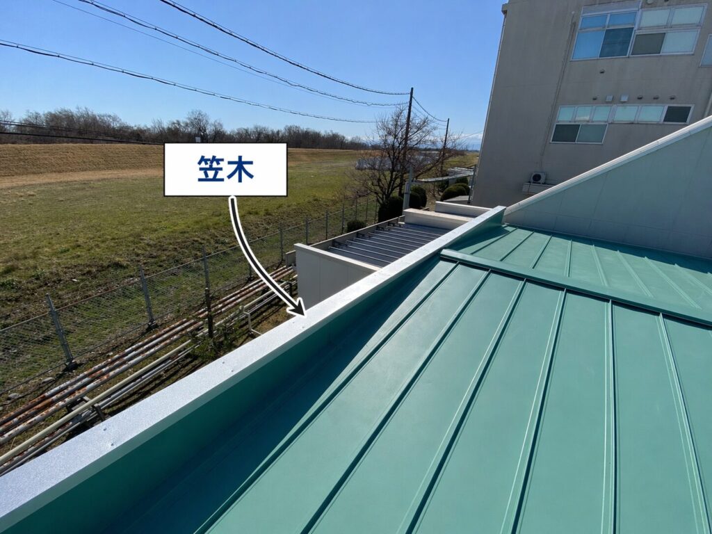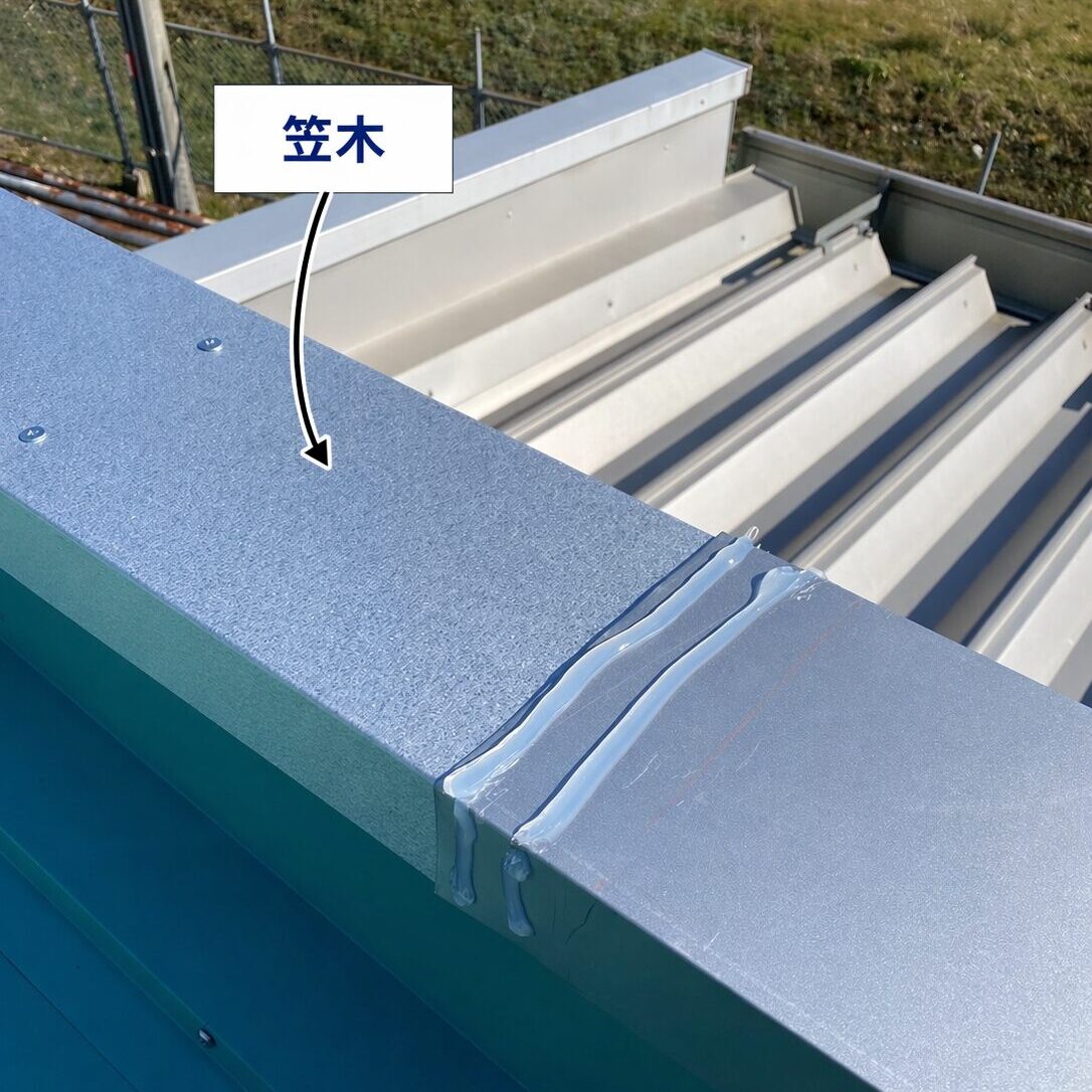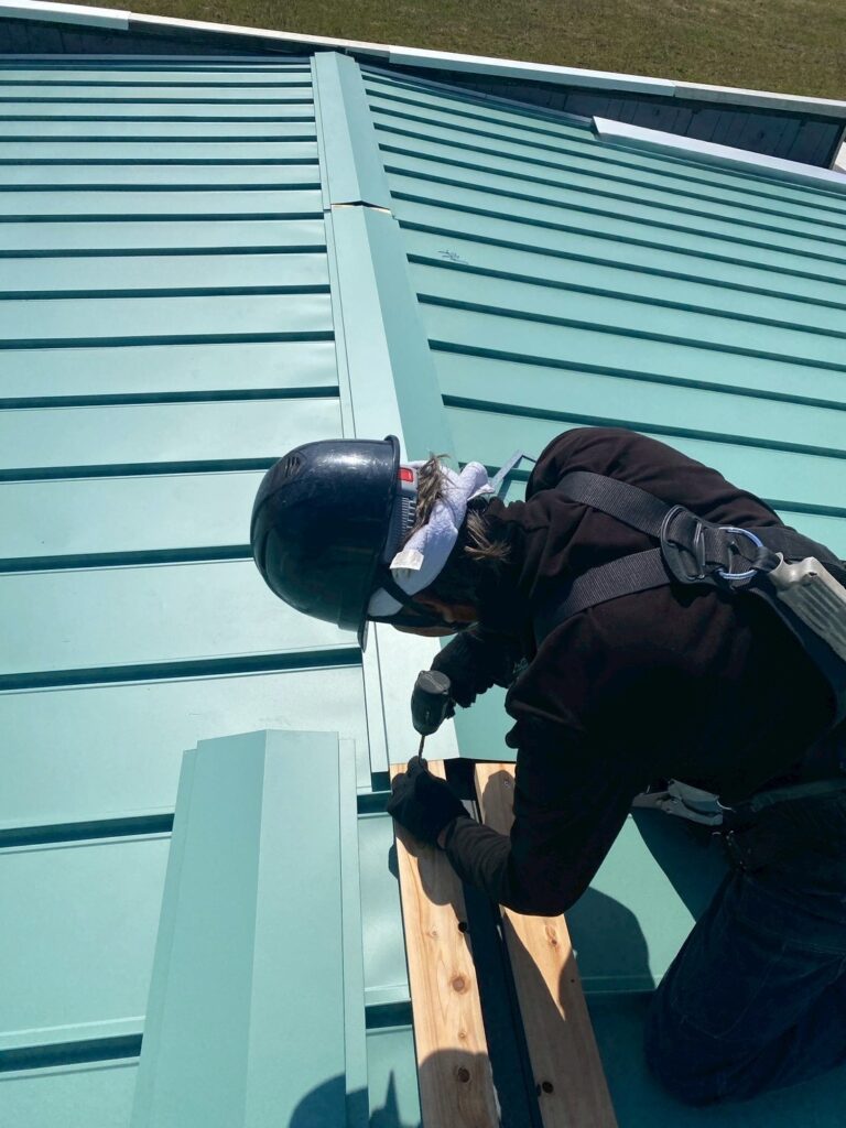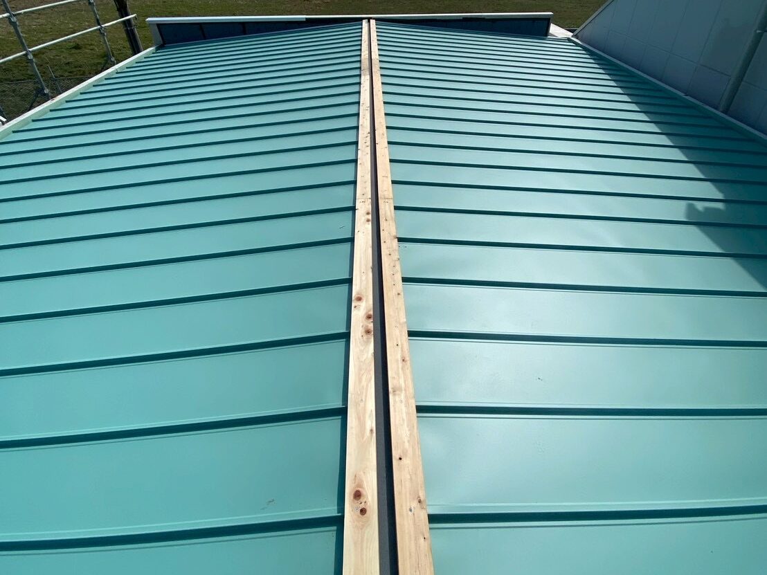 新設屋根葺き施工完了後、棟板金・各端部の役物施工をしていきました。