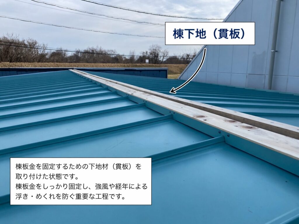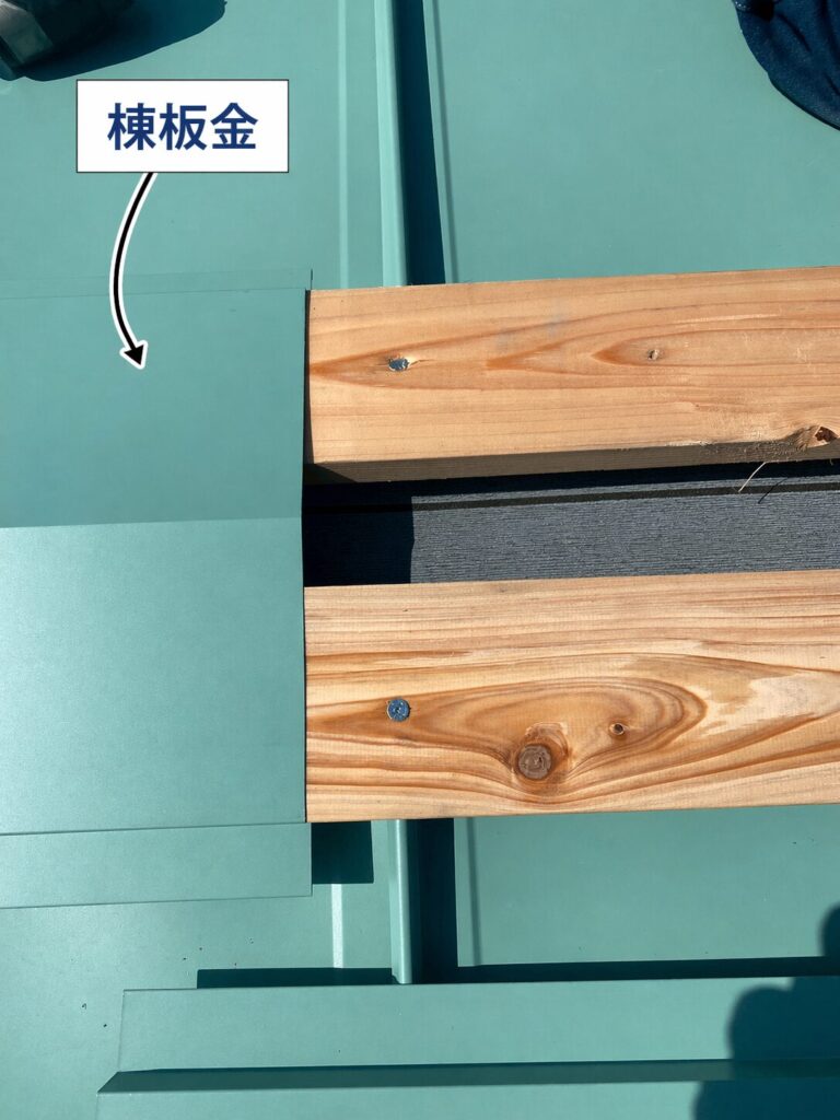棟下地取付完了後、棟下地の上に棟板金を被せる形で施工していきました。