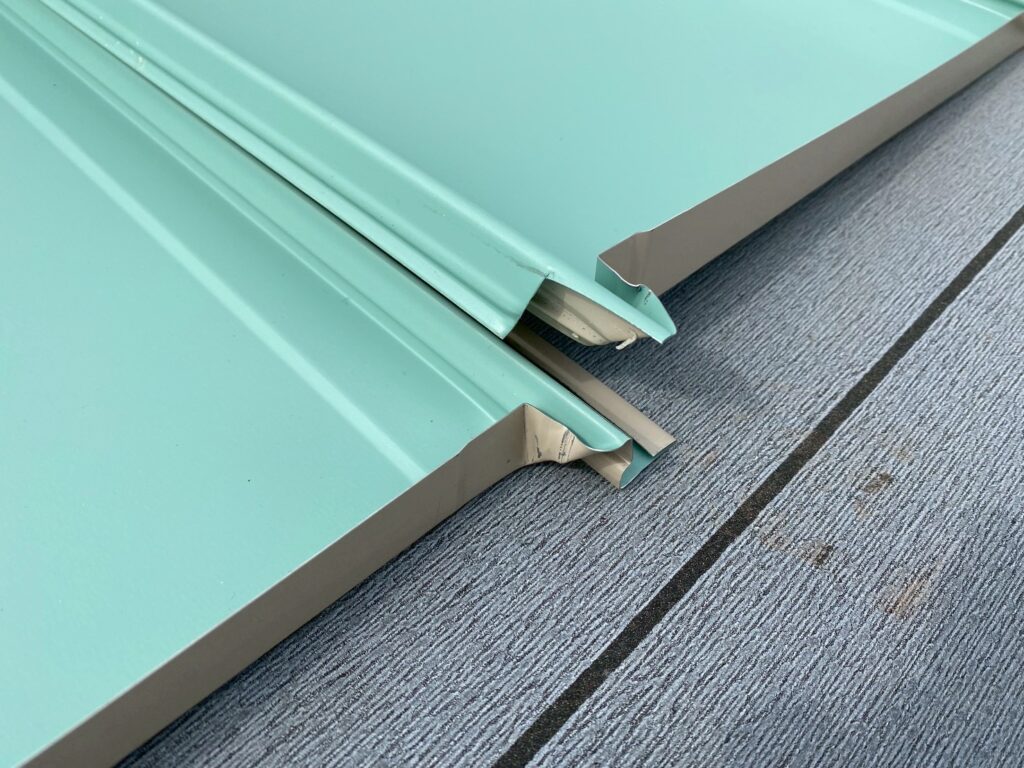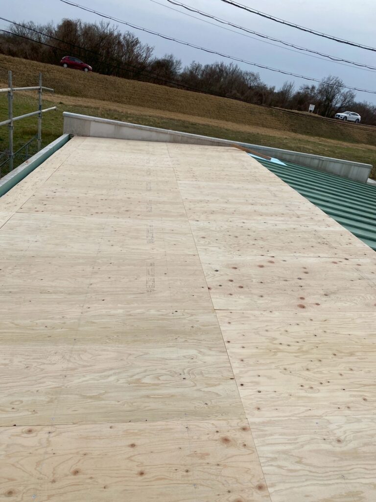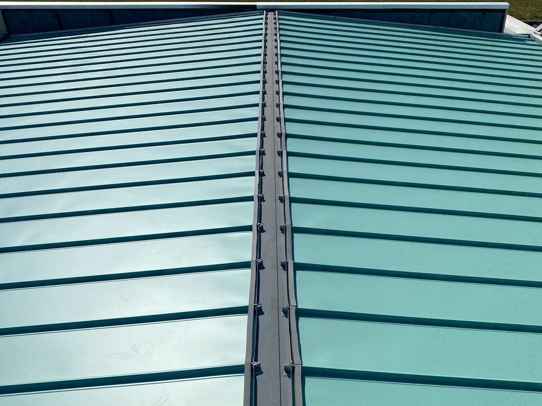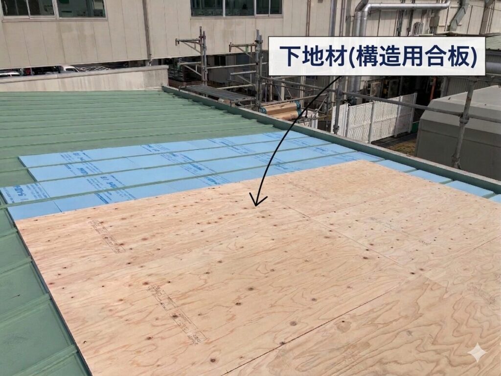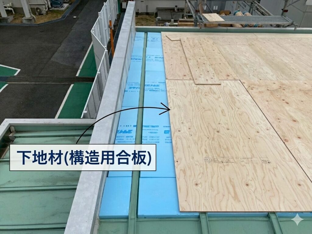 立平葺きを採用。ビブレスルーフシート(制振シート)に加え、断熱材(スタイロフォーム)と合板下地を重ねることで、遮音性と断熱性を大幅に向上させます 。