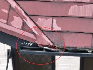 雨漏りを起こしている真上の屋根の谷の納まりが悪く、雨樋の勾配が緩く