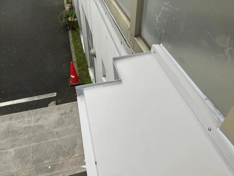 対策として、谷樋の部分を塞ぐイメージで水切り板金を施工することをご提案させていただき、