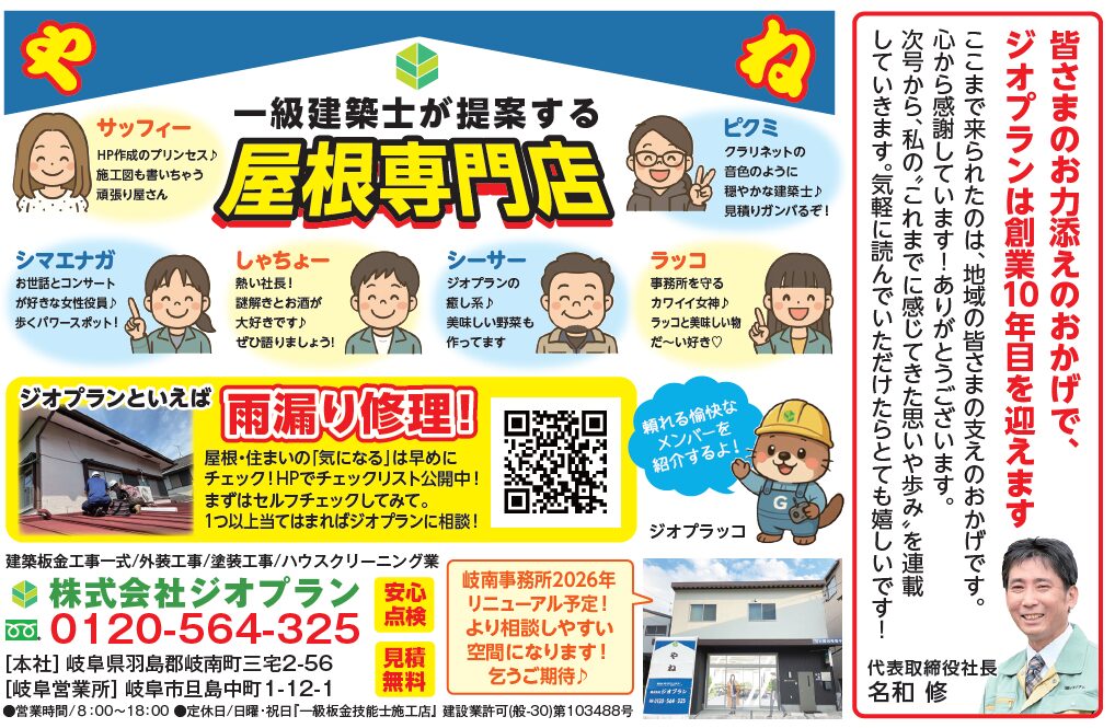 只今、配布中の地域情報誌GiFUTO 1月号に掲載中です😊 ジオプランは南部版は45ページ、北部版は43ページの『家族会議』のコーナーに掲載しています。 今回は社長の挨拶と、ジオプランのスタッフ紹介をしています。 それにしても、早いもので気が付... CSR・社会貢献活動